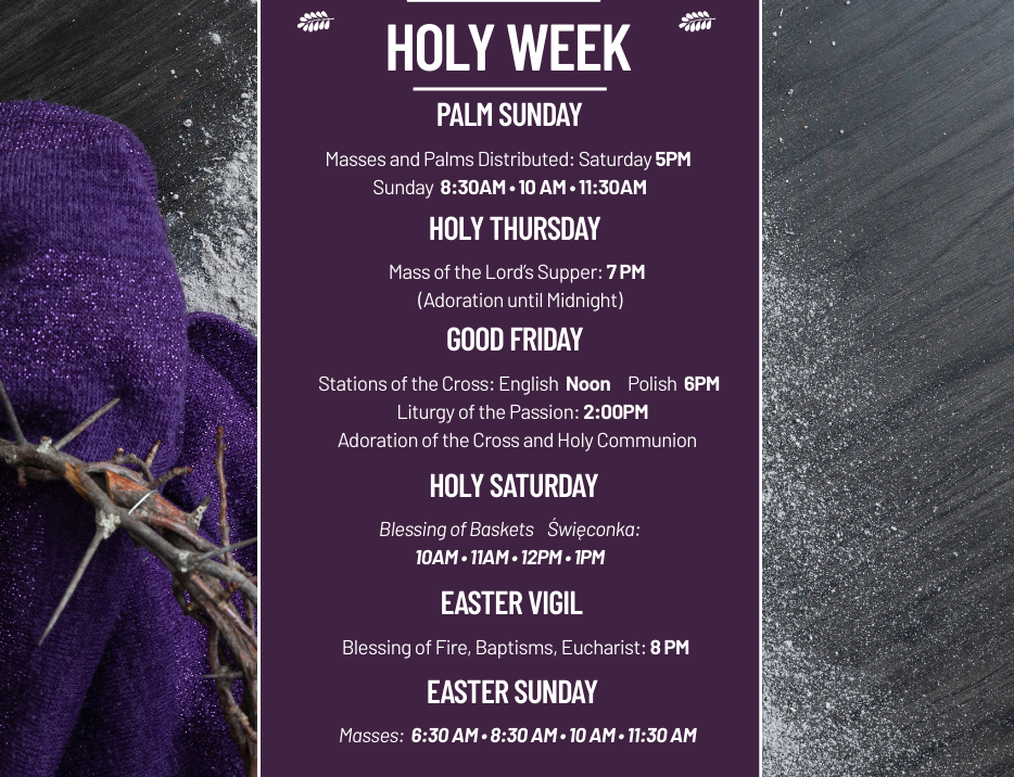Sunday: 8:30 AM (English), 10:00 AM (Polish), 11:30 AM (English)