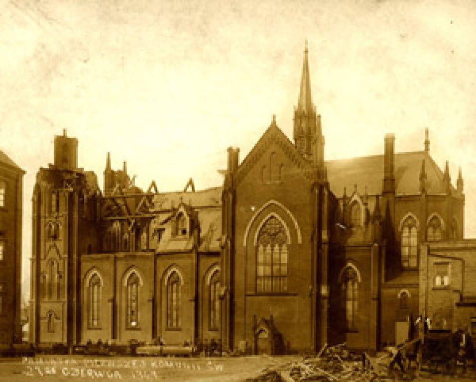 On April 21, 1909, a tornado destroyed the twin spires at the front of the church and also devastated the roof. The parishioners bonded together and rebuilt the church within the year. The city did not allow the spires to be built to their original height.